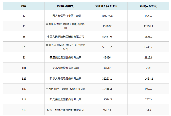在2025年《财富》中国500强排行榜中,共有10家保险公司上榜,分别是:中国人寿保险(集团)公司(第12位)、中国平安保险(集团)股份有限公司(第13位)、中国人民保险集团股份有限公司(第39位)、中国太平洋保险(集团)股份有限公司(第65位)、泰康保险集团股份有限公司(第83位)、友邦保险控股有限公司(第101位)、新华人寿保险股份有限公司(第129位)、中国再保险(集团)股份有限公司(第189位)、阳光保险集团股份有限公司(第214位)、众安在线财产保险股份有限公司(第410位)。