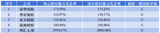 截至目前,在已披露偿付能力报告的险企中,前海财险、安华农险、华安财险、亚太财险、华汇人寿五家的风险综合评级均为C,不达标