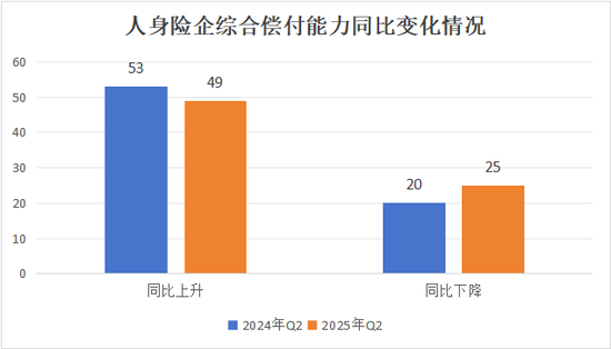 从变化趋势来看,2025年二季度74家人身险企中有49家综合偿付能力实现正增长,较2024年同期减少4家;偿付能力下滑险企数量25家,较2024年同期增加了5家。