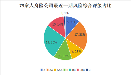 具体来看,73家披露最近一期风险评级的人身险企中,33家评级达到A类。其中,AA级人身险企为A类险企中数量最多的评级,共17家,占总数的23%;其次为A级和AAA级,分别有8家险企,各占比11%。