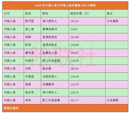 2024年,中国人寿高管中年薪超过百万的有副总裁、首席投资官刘晖,税前年薪161.89万,副总裁、首席风险官阮琦税前年薪159.89万,监事会主席曹伟清税前薪酬168.81万,职工代表监事叶映兰税前薪酬118.54万,副总裁白凯税前年薪160.54万,合规负责人许崇苗税前年薪139.46万,总精算师侯晋税前年薪110.32万,审计责任人胡志军税前年薪为126.15万。