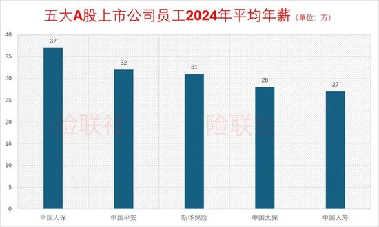 2024年,中国人保、中国平安、新华保险、中国太保和中国人寿内勤员工的人均薪酬分别为37万、32万、31万、28和27万。