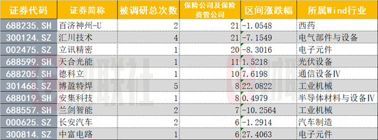 其中,分属于西药、电气部件与设备、电子元件的百济神州、汇川技术与立讯精密均获得超20家险资机构前来调研,成为险资机构热捧的对象。与此同时,所属Wind行业为光伏设备、通信设备Ⅳ的天合光能、德科立也是险资青睐的香饽饽,11月以来有超10家险资机构到访。