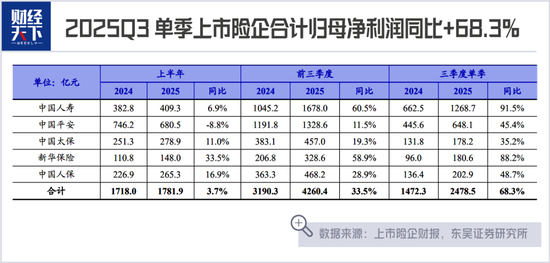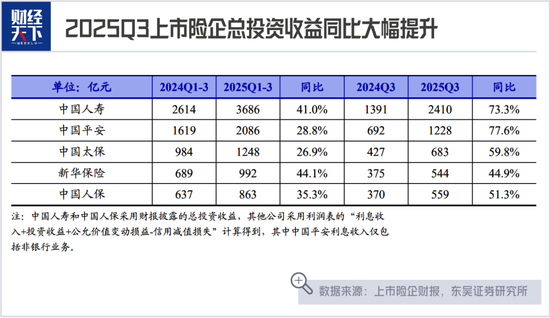 过去连续几个季度的财报中,险企的投资表现都令市场眼前一亮。东吴证券统计数据显示,上市险企2025年前三季度总投资收益合计为8875亿元,同比增长35.64%;其中,仅第三季度就贡献了5424亿元,同比增长66.64%。
