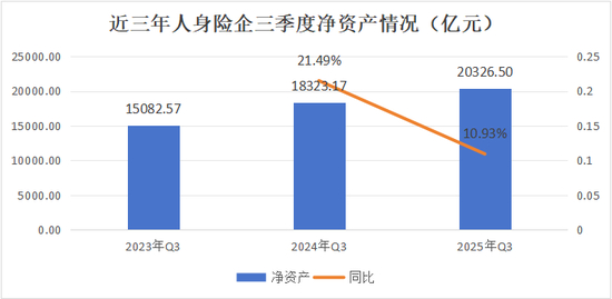 2025年三季度,人身险业净资产规模达2.03万亿元,较2024年同期增加约2000亿元,同比增长10.93%,增速大幅放缓且在大小险企中分化明显。相关数据综合来看,2025Q3净资产数据的增加主要靠老几家的稳健增长及中小险企的增资发债。