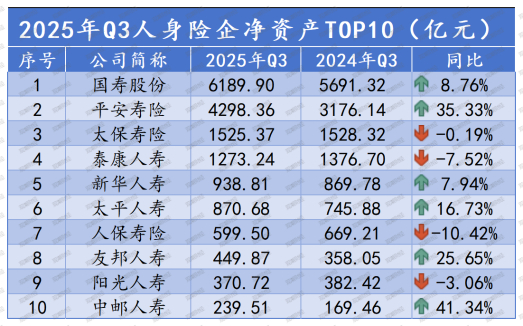 具体来看,2025年Q3,国寿股份净资产同比上升8.76%,突破六千亿元;平安人寿净资产突破四千亿元,同比增长35.33%;太保寿险、泰康人寿净资产则同比下降,分别为1525.37亿元、1273.24亿元。