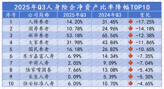 与2024年Q3相比,2025年Q3净资产比率下降TOP10的险企中,养老保险公司占据前五。这或意味着,虽然养老保险公司净资产比率基数较高,但正因业务扩张持续消耗中。