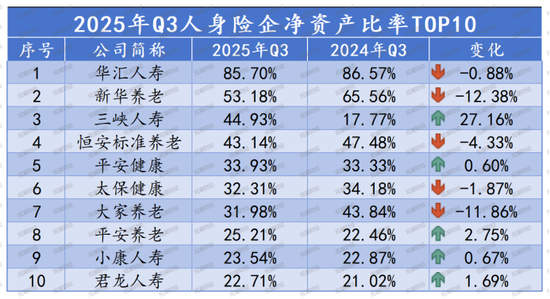 从2025年Q3净资产比率排名前十来看,有4家寿险公司、4家养老保险公司、2家健康险公司,这与不同类别险企业务结构有关。