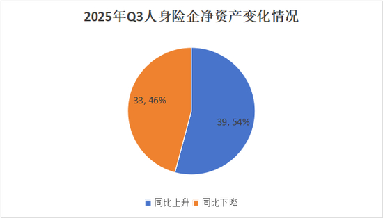 已公布2025年Q3净资产的72家人身险企中,54%险企实现净资产正增长,而46%的公司出现同比下降,这与2024年同期数据相去甚远。
