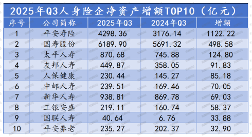 数据显示,2025年前三季度净资产增额TOP10中前七位均为大中型险企,国寿、平安、新华、太平、友邦、人保健康、中邮人寿等7家人身险企净资产增额共计2061.69亿元,而险企的增资发债金额共计1051.84亿元。