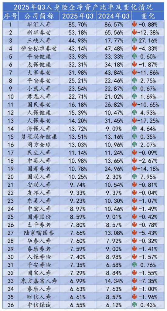 其中,三峡人寿净资产比率增长最快,2025年Q3净资产比率为44.93%,较2024年Q3增加了27.16个百分点。其余险企变化均未超10%。