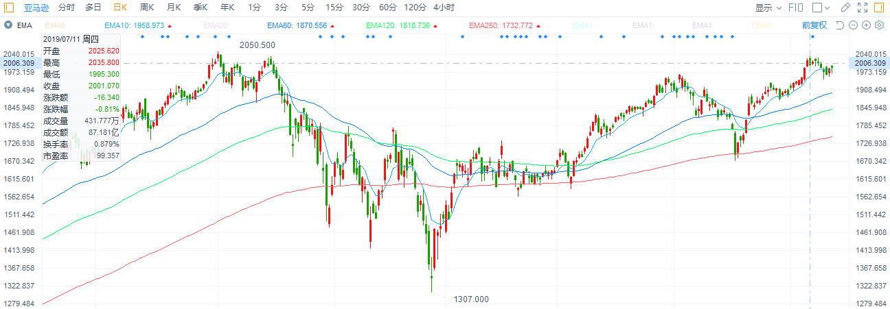 大约一年前,2018年9月的时候,背靠着顺风顺水的美股,亚马逊股价最高涨至2050美元,市值一度站上万亿大关,但随后一年里股价就再未有突破。最为接近的,是在2019年7月11日,亚马逊股价最高冲至2035美元,市值达到了9991亿美元。