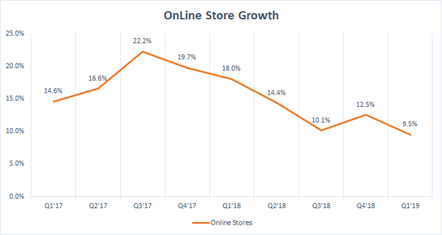 占比第二的第三方卖家服务最近几个季度也在下滑,在2018Q1达到峰值43.9%,2019Q1下降到仅20%。