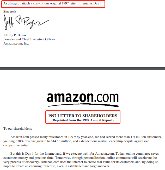 1997 年,在亚马逊的第一封致股东信中,贝佐斯发表了 「一切都要从长计议」 的宣言,阐述了他对亚马逊的经营之道:「亚马逊所有的工作都将围绕长期价值展开」。此后每一年,贝佐斯都会在股东信里另附上他在 1997 年的这一封信,至今已有 22年。