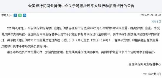 公告称,2019年7月2日,平安银行和招商银行在银行间债券回购市场达成DR001为0.09%的异常利率交易。经两家银行自查,为交易员操作失误所致。全国银行间同业拆借中心现对平安银行和招商银行进行通报批评,要求两家机构加强风险控制和内部管理,并依据《银行间本币市场交易员管理办法(试行)》(中汇交发〔2014〕196号),暂停平安银行和招商银行相关交易员的银行间本币市场交易员资格1年。