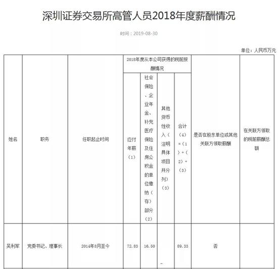 自2014年8月起,吴利军出任深交所党委书记、理事长。据深交所信息披露,吴利军2018年税前报酬合计89.33万元,其中年薪为72.83万元,与深交所总经理、监事长年薪持平。
