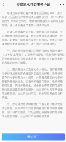 具体来看,以某股份行APP的交易流水打印服务协议为例,该行在提供该服务前,需向用户以文字形式明确告知,使用该功能即表示用户“授权并同意我行按照您的申请查询您的交易流水信息,并通过电子邮件发送到您指定的电子邮箱。”