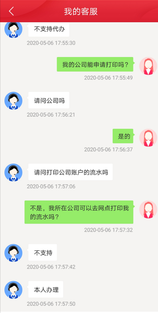 针对这一情况,新浪金融研究院咨询了中信银行APP的人工客服,而其在回复中明确表示“不支持”,需要“本人办理”,且没有提到“配合大客户”等特殊情形下,公司可以直接打印员工流水。