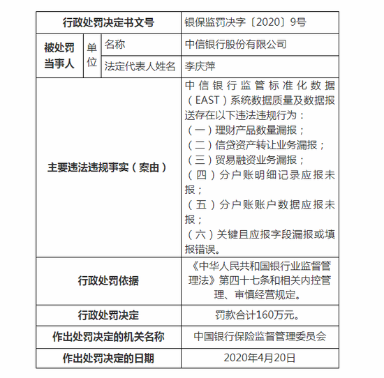 中信银行因存在理财产品数量漏报;信贷资产转让业务漏报;贸易融资业务漏报;分户账明细记录应报未报;分户账账户数据应报未报;关键且应报字段漏报或填报错误的行为,被罚160万元。