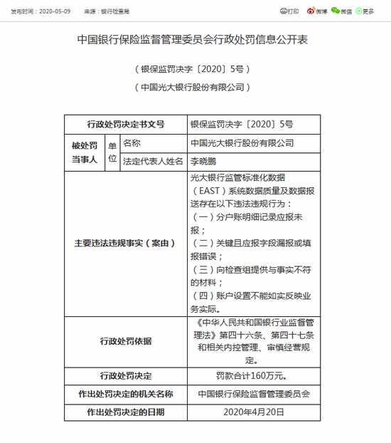 光大银行因存在分户账明细记录应报未报;关键且应报字段漏报或填报错误;向检查组提供与事实不符的材料;账户设置不能如实反映业务实际的行为,被罚160万元。
