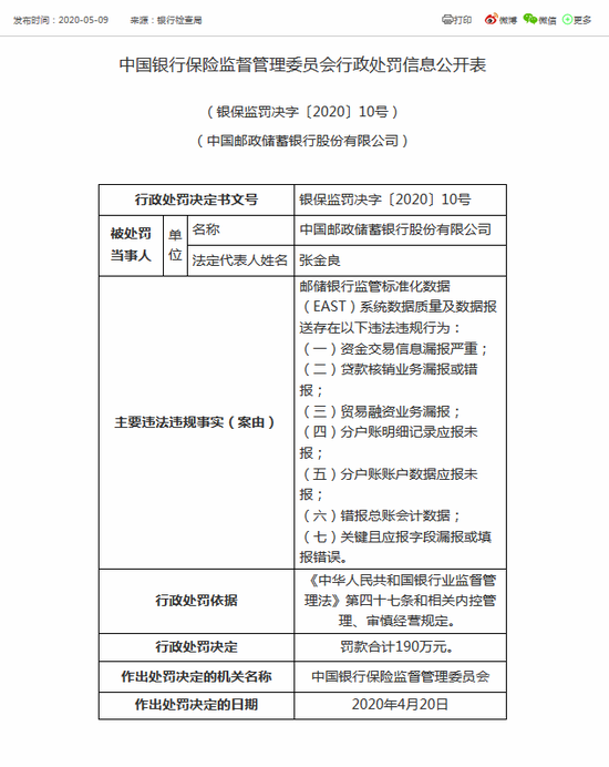 邮储银行因存在资金交易信息漏报严重;贷款核销业务漏报或错报;贸易融资业务漏报;分户账明细记录应报未报;分户账账户数据应报未报;错报总账会计数据;关键且应报字段漏报或填报错误的行为,被罚190万元。
