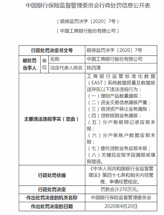 具体来看,工商银行因存在理财产品数量漏报;资金交易信息漏报严重;信贷资产转让业务漏报;贷款核销业务漏报;分户账明细记录应报未报;分户账账户数据应报未报;委托贷款业务应报未报;关键且应报字段漏报或填报错误这八项违法违规行为被罚270万元。