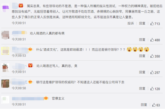 网友纷纷表示,厦门国际银行这名领导的举止,显然不能简单用“酒桌文化”来解释和掩盖。“有些领导劝的不是酒,是一种强人所难的服从性测试,一种权利的精神满足。”“这就是职场霸凌!!!”……这样的观点收获了众多网友点赞。对于厦门国际银行的处理方式,也有不少网友认为是“罚酒三杯”。