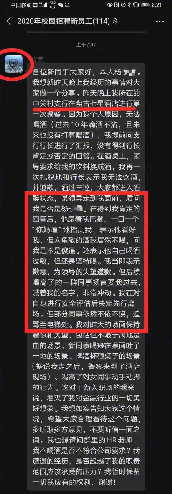 23日,先是一张微信群聊天截图在网络流传。截图显示,在名为“2020年校园招聘新员工”的微信群中,新员工杨某表示,其与同事在北京盘古七星酒店聚餐时,因没喝“A角”敬的酒,被某领导殴打辱骂。