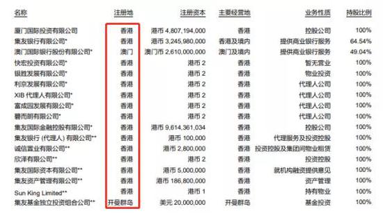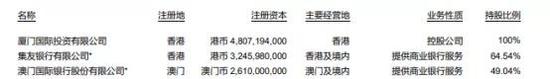 2019年年报显示,集友银行注册资本32.46亿港币,澳门国际银行注册资本26.10亿澳门币。厦门国际银行100%持股厦门国际投资,其对集友银行和澳门国际银行的持股比例分别为64.54%和49.04%。厦门国际银行拥有上述两家银行的经营和财务决策权。