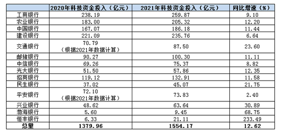 据目前已披露的6家国有大行和8家股份行2021年报显示,14家银行去年共投入科技资金达1554.17亿元,同比增长12.62%。其中,6家国有大行投入总量1074.93亿元,同比增长10.77%;8家股份制银行(中信银行、光大银行、招商银行、民生银行、平安银行、兴业银行、渤海银行、恒丰银行)投入总量为479.24亿元,同比增长17.02%。