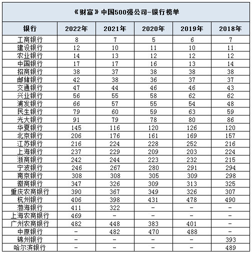 据2022年《财富》中国500强排行榜显示,共有24家商业银行上榜,按各银行2021年营业收入排名,工行位居榜首,其次是建行、农行、中行、招行、邮储银行、交行、兴业银行、浦发银行、民生银行、光大银行、华夏银行、北京银行、江苏银行、上海银行、浙商银行、宁波银行、南京银行、徽商银行、重庆农商行、杭州银行、渤海银行、上海农商行、广州农商行。