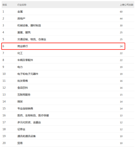 从“《财富》中国500强分行业榜”看,2022年共有24家商业银行上榜,在35个行业中排名第六位,较上一年下降一名。