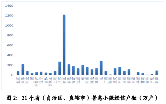 在普惠小微授信户数方面,浙江、广东、江苏、天津、安徽等地普惠小微授信户数相对较多,接近全国普惠小微授信户数的一半,青海、西藏等地普惠小微授信户数相对较少。