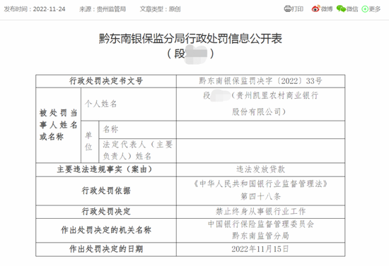近日,黔东南银保监分局公布的一则罚单显示,凯里农商行员工段某芬因违法发放贷款,被禁止终身从事银行业工作。