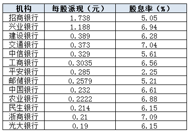 股份制银行方面,招行每股拟现金分红1.738元(含税),遥遥领先于其他12家上市银行;兴业银行每股拟派现超过1元,为1.188元;其次是中信银行、平安银行、民生银行、浙商银行、光大银行。