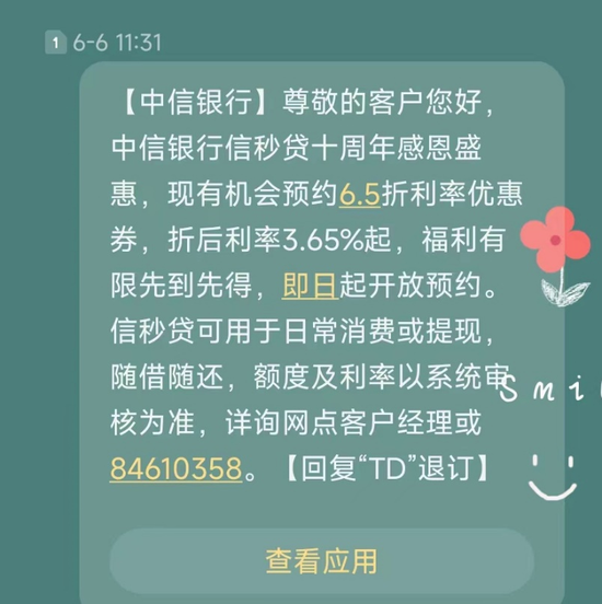 “尊敬的客户您好,XX银行XX贷十周年感恩盛会,现有机会预约6.5折利率优惠券,折后利率3.65%起。”据消费者李女士讲述,近日她收到多家银行的消费贷营销电话、短信等,邀请她办理贷款,且利率一家比一家低,年化利率普遍在“3”字头起。