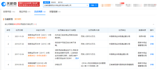 事实上,除了上述罚单外,天眼查显示,云南昭通昭阳农商行还曾在2021年、2019年、2017年、2016年遭到原中国银保监会昭通监管分局、中国银监会昭通监管分局、云南省昭通市国家税务局稽查局的处罚。其中,2021年、2019年、2017年的处罚事由均与贷款业务相关。