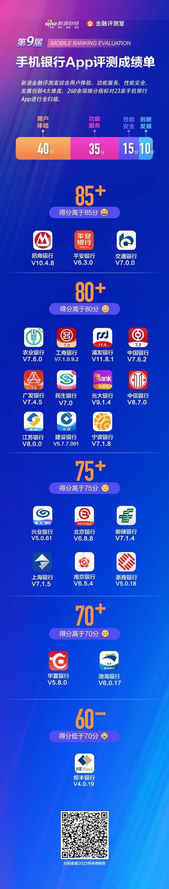 在过去的一年里,新浪金融评测室根据已获多方认可的评测标准,借鉴往年评测的成功经验,并结合手机银行App发展新趋势,综合用户体验、功能服务、性能安全、创新发展4大维度、260余项细分指标对23家手机银行App进行全扫描。