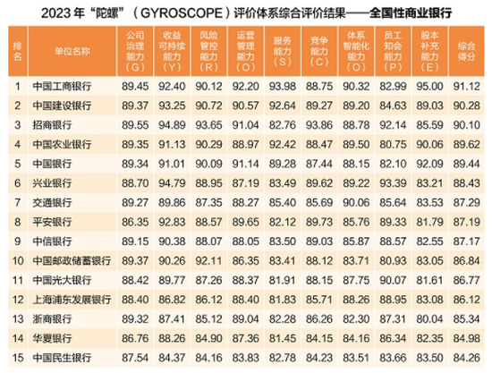 从中国银行业协会发布的“2023年‘陀螺’(GYROSCOPE)评价体系综合评价结果——全国性商业银行”榜单看,综合得分排名前15名的银行分别为工商银行、建设银行、招商银行、农业银行、中国银行、兴业银行、交通银行、平安银行、中信银行、邮储银行、光大银行、浦发银行、浙商银行、华夏银行、民生银行。