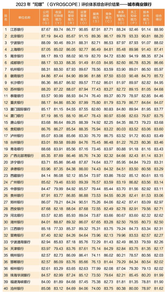 江苏银行位居城商行榜单首位,