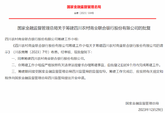 同样据国家金融监督管理总局官网行政许可披露,2023年12月29日,国家金融监督管理总局批复同意筹建四川农村商业联合银行股份有限公司。