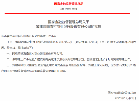 此外,国家金融监督管理总局官网批复显示,2023年12月29日,同意筹建海南农村商业银行股份有限公司。