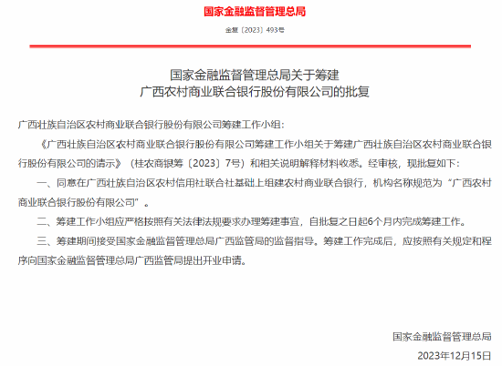 据国家金融监督管理总局官网批复,2023年12月15日,国家金融监督管理总局批复同意,广西农村商业联合银行股份有限公司为广西壮族自治区农村信用社联合社基础上组建,机构名称规范为“广西农村商业联合银行股份有限公司”。