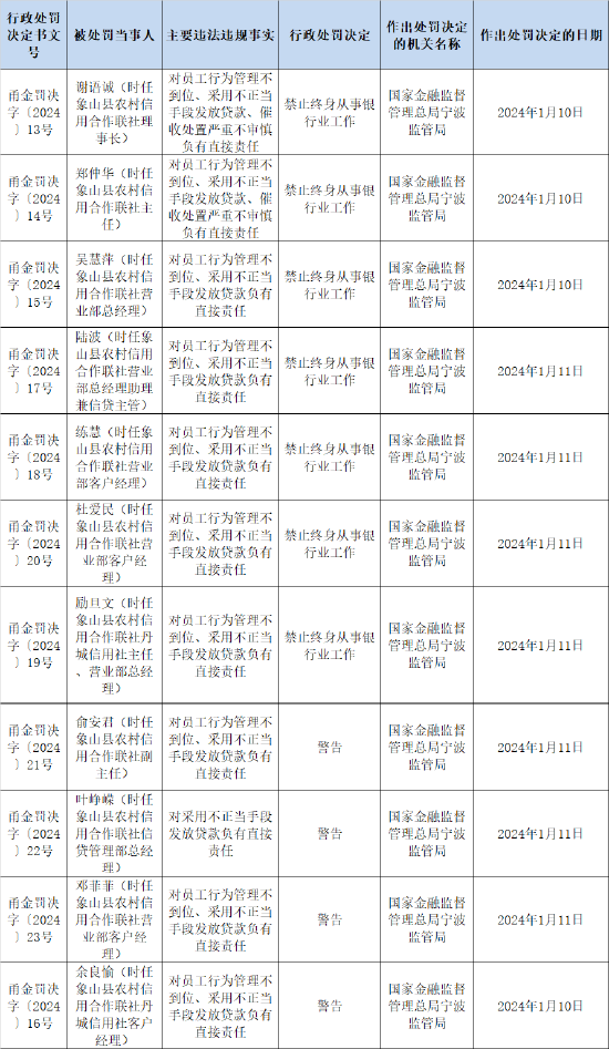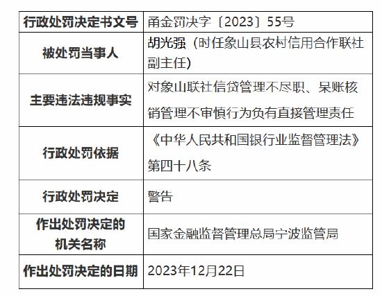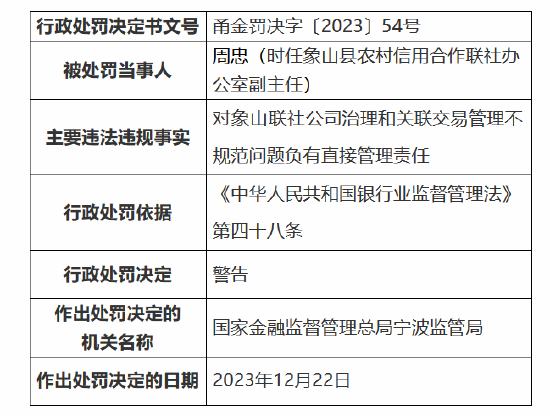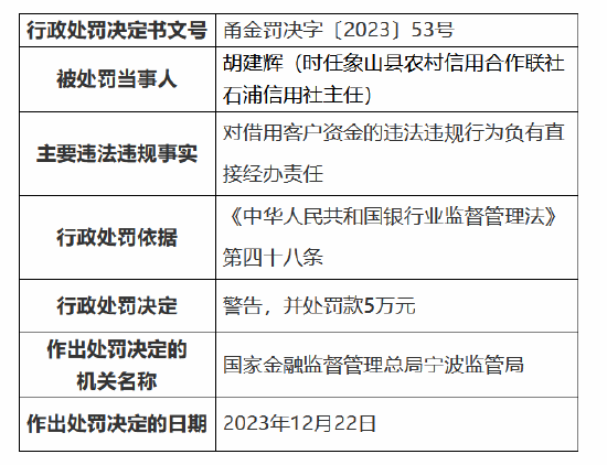 罚单显示,象山县农村信用合作联社办公室副主任周忠因公司治理和关联交易管理不规范问题被警告,象山县农村信用合作联社副主任胡光强因信贷管理不尽职、呆账核销管理不审慎行为被警告,象山县农村信用合作联社石浦信用社主任胡建辉因借用客户资金被警告并处罚款5万元。