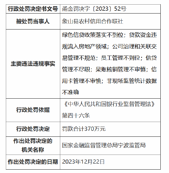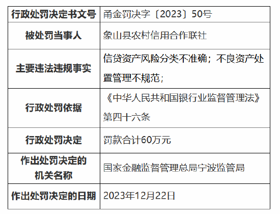 此外,象山县农村信用合作联社还因信贷资产风险分类不准确、不良资产处置管理不规范,被罚60万元。