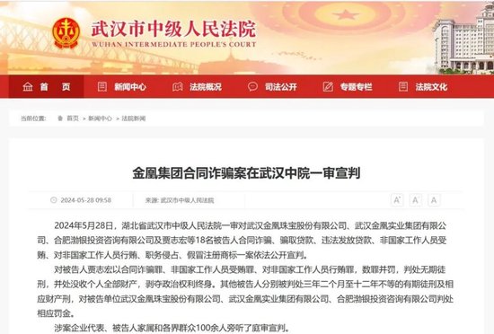 5月28日,湖北省武汉市中级人民法院一审对武汉金凰珠宝股份有限公司、武汉金凰实业集团有限公司、合肥渤银投资咨询有限公司及贾志宏等18名被告人合同诈骗、骗取贷款、违法发放贷款、非国家工作人员受贿、对非国家工作人员行贿、职务侵占、假冒注册商标一案依法公开宣判。