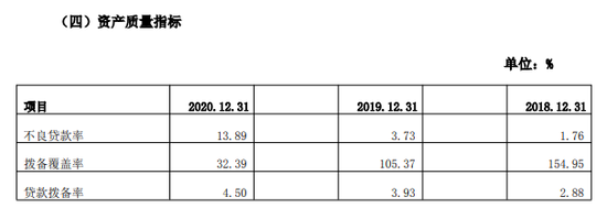 从资产质量情况看,2020年末,该行不良贷款率高达13.89%,与前两年相比增长较大。年报显示,该行2019年末为3.73%;2018年末则为1.76%。