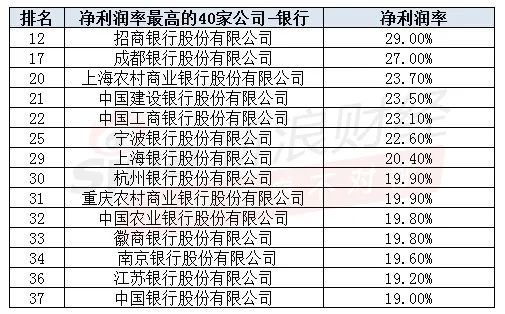 与2023年榜单相比变化较大,彼时有9家银行上榜,兴业银行是唯一未登上今年净利润率最高的40家公司的银行,其他8家银行均在今年相关榜单之上,即招商银行、工商银行、建设银行、宁波银行、上海农商行、中国银行、南京银行、上海银行。