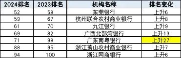 排名上升名单中,广东南粤银行表现最佳,排名跃升71位;网商银行则由2023年的100位上升至2024年的94位。