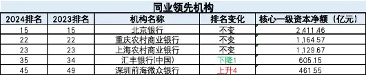 在城商行中,北京银行仍稳居榜首,核心一级资本净额为2411.46亿元,居于上述100家银行中的第15位。